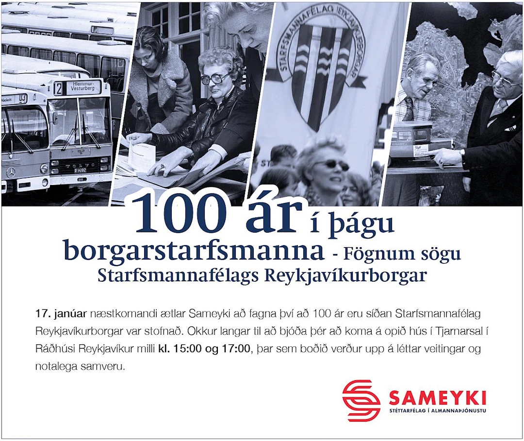 Laugardaginn 17. janúar næstkomandi eru liðin 100 ár frá stofnun Starfsmannafélags Reykjavíkurborgar, annað af stofnfélögum Sameykis stéttarfélags í almannaþjónustu sem stofnað var snemma árs 2019. Af því tilefni ætlar Sameyki að halda upp á tímamótin með opnu húsi í Tjarnarsal í Ráðhúsi Reykjavíkur milli kl. 15:00 og 17:00, þar sem boðið verður upp á léttar veitingar og notalega samveru.