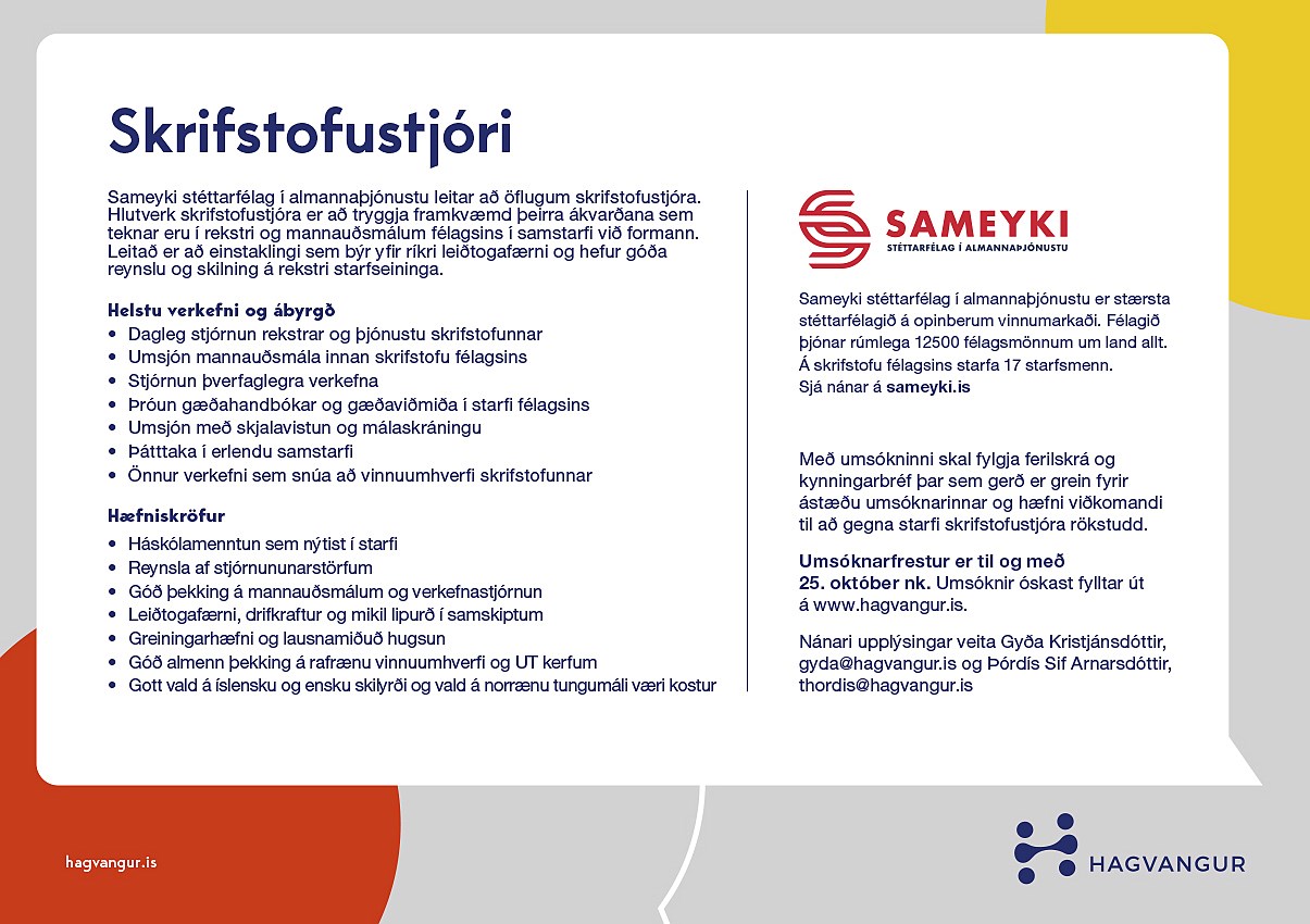 Umsóknarfrestur er til og með 25. október nk. Umsóknir óskast fylltar út á vefsíðu Hagvangs, sjá hér.