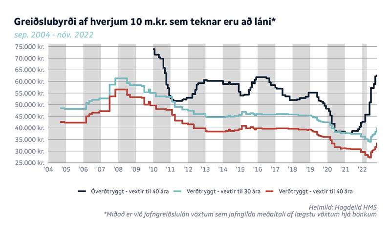 HMS segir að hækkandi vextir gera það að verkum að greiðslubyrði lána hækkar, bæði verðtryggðra og óverðtryggðra. Greiðslubyrði óverðtryggða lána er nú frá 62.300 kr. fyrir hverjar 10 m.kr. sem eru teknar að láni en var 45.700 kr. í maí á þessu ári og 37.700 í maí í fyrra. Eins og fram kom í síðustu mánaðarskýrslu HMS eru um 46% af útistandandi óverðtryggðum íbúðarlánum á breytilegum vöxtum. Stór hluti af öðrum óverðtryggðum lánum eru með vaxtaendurskoðun á næstu tveimur árum og þá sérstaklega árið 2024. Því er ljóst að stór hluti heimila í landinu annað hvort býr við verulega aukinn húsnæðiskostnað eða sér fram á verulega aukningu.