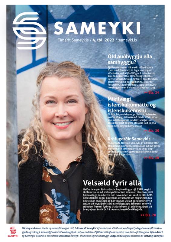 Heiður Margrét Björnsdóttir, hagfræðingur hjá BSRB, prýðir forsíðu Tímarits Sameykis að þessu sinni. Hún skrifar um velsæld í íslensku samfélagi út frá grunnþörfum fólks og kjöraðstæðum af kögunarhóli hagfræðingsins. Hún segir að ríkisstjórn Íslands þurfi að gera betur, því velsæld er ekki einungis hagvöxtur. Hún segir m.a.: „Ákvarðanir ættu alltaf að taka mið af samfélagslegum áhrifum og velsæld allra íbúa en ekki eingöngu fjárhagslegum áhrifum. Hér á landi eru umsvif ríkissjóðs og stefna ríkisstjórnarinnar hverju sinni bundin umgjörð sem lög um opinber fjármál skapa. Orðið velsæld kemur hvergi fyrir í þeim lögum, hið sama á raunar við um orðin íbúi eða fólk.“