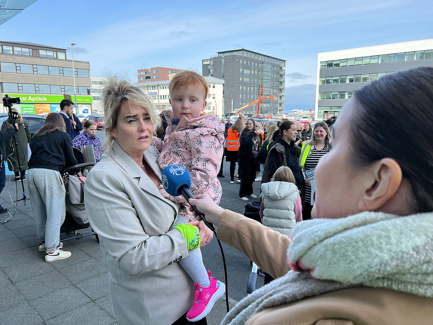 „Ég á líka eina þriggja vikna sem mun vonandi komast inná leikskóla haustið 2024. Í störfum fólks á leikskólum er rútína yfir daginn þar sem börnin njóta sín vel í rútínunni og finna fyrir öryggi. Þar er þeim kennd félagsleg hæfni, læra að leika sér með vinum sínum o.s.frv. Þetta starfsfólk er ómissandi, er í ómissandi störfum. Það er með gott og notalegt viðmót og hefur gaman af því að kenna börnum, sinna daglegum athöfnum þeirra og dansa með þeim og syngja, skeina þeim, þvo hendur þeirra, gefa þeim að borða. Börn verða líka óörugg þegar það er mikil starfsmannavelta. Við vitum að starfsmannavelta orsakast að hluta til af óánægðu starfsfólki vegna launamisréttis og álagas í vinnu. Einnig ættu launin auðvitað að hækka í samræmi við verðbólgu. Semjið strax fyrir okkar framtíðar kynslóðir,“ sagði Erla Þórdís.