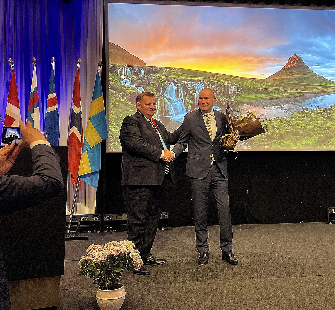 Knut Roger, framkvæmdastjóri NTR, óskaði forseta Íslands, Guðna Th. Jóhannessonar til hamingju með afmælisdaginn, færði honum blómvönd og þakkaði honum komuna á ráðstefnuna sem er í fyrsta sinn í sögu NTR að þjóðhöfðingi flytur ávarp á ráðstefnu þess.