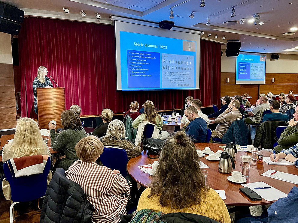 Þá spurði hún salinn hvort þau þekki til að ríkisstjórnin hafi sett hér á landi velsældarmælikvarða. Fáir ef nokkrir minntust þess.