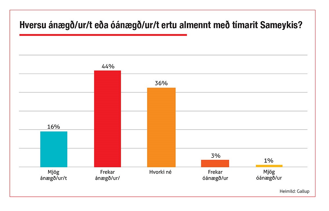 Þegar spurt var um hversu ánægt félagsfólk var með tímaritið eða óánægt svöruðu samtals 95 prósent því að það væri mjög ánægt, frekar ánægt og hvorki né ánægt, með tímaritið. Samtals 4 prósent svarenda voru frekar óánægðir eða mjög óánægðir með tímarit Sameykis.