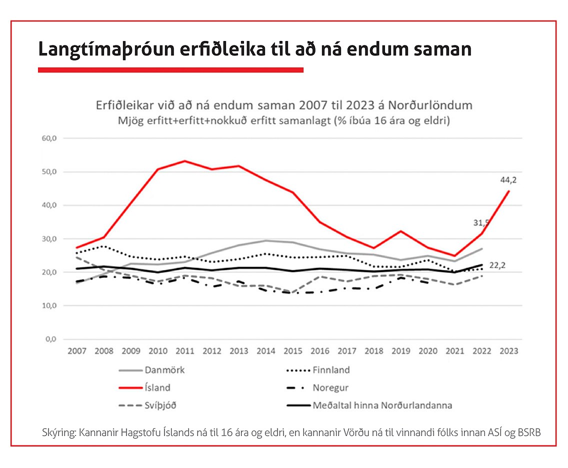 Skoðum afkomu launafólks. Til þess samanburðar höfum við tölur frá hinum Norðurlöndunum og sjáum að erfiðleikar launafólks á Íslandi eru mun meiri við að ná endum saman en í nágrannalöndum okkar. Síðustu tvö árin höfum við verið að rjúka upp fyrir hin Norðurlöndin sem ná yfirleitt ekki lengra en 22 prósent enn sem komið er. Samkvæmt könnunum á hinum Norðurlöndunum er ekki að vænta hækkana um leið og við hér á landi rjúkum upp í 44,2 prósent. Við þessu þarf að bregðast í komandi kjarasamningum en kaupmáttur ráðstöfunartekna heimilanna hefur minnkað mikið, eða um 5 prósent nú, sem gefur okkur raunsærri mynd af afkomunni. Það er ljóst að auka þarf kaupmátt launafólks.“