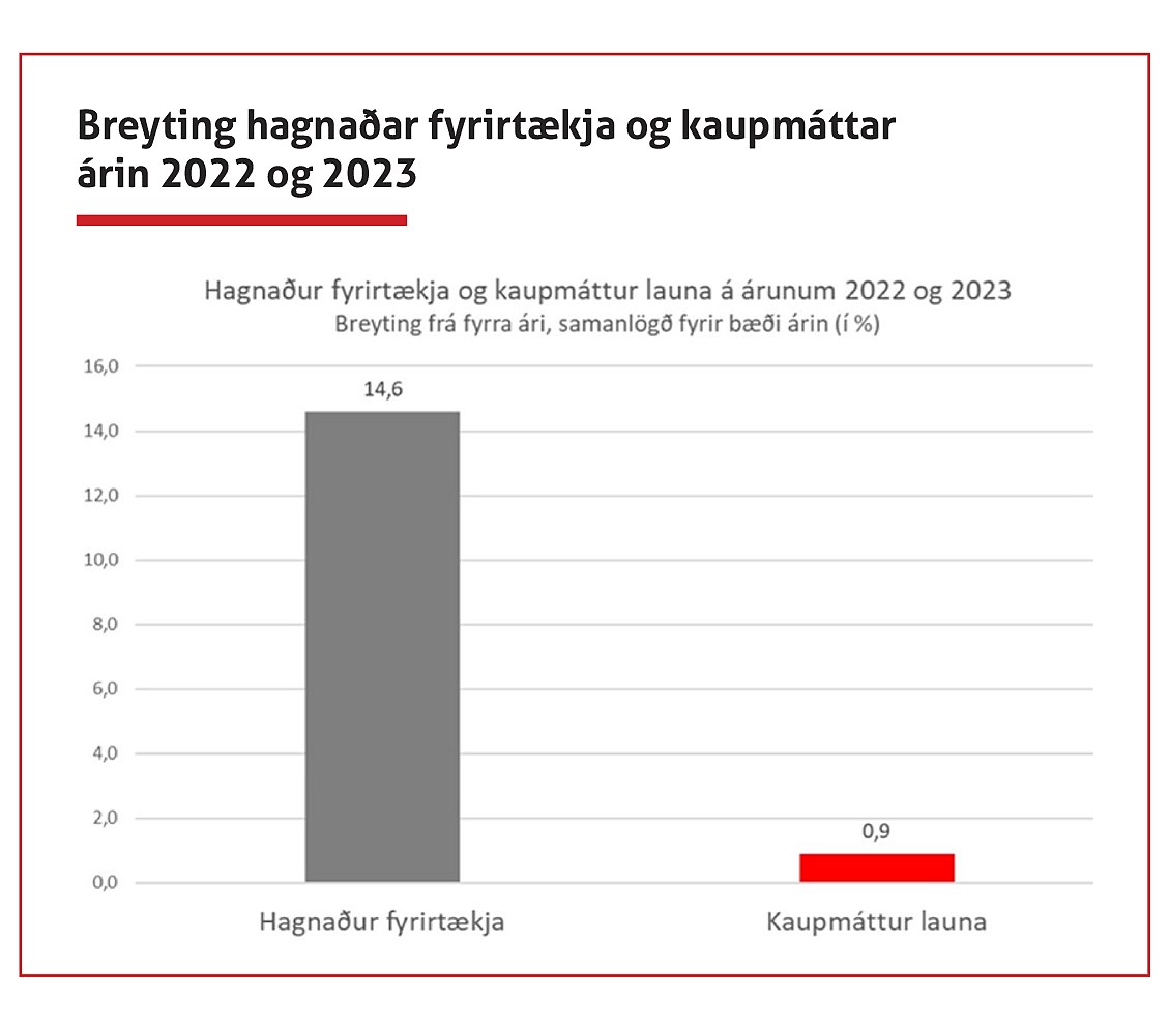 „Ég áætla að hagnaðaraukning fyrirtækjanna sé 14,9 prósent á meðan kaupmáttur launa er 0,9 prósent, samanlagt á verðbólguárunum 2022 og 2023. Við höfum verið að segja í verkalýðshreyfingunni að ein ástæða verðbólgunnar sé vegna hagnaðaraukningar fyrirtækjanna. Þessar tölur sanna það. Aukning hagnaðar íslenskra fyrirtækja er sú þriðja mesta í Evrópu á síðastliðnum tveimur árum. Það er því mjög langsótt að kenna launahækkunum einum um verðbólguþrýstinginn.“