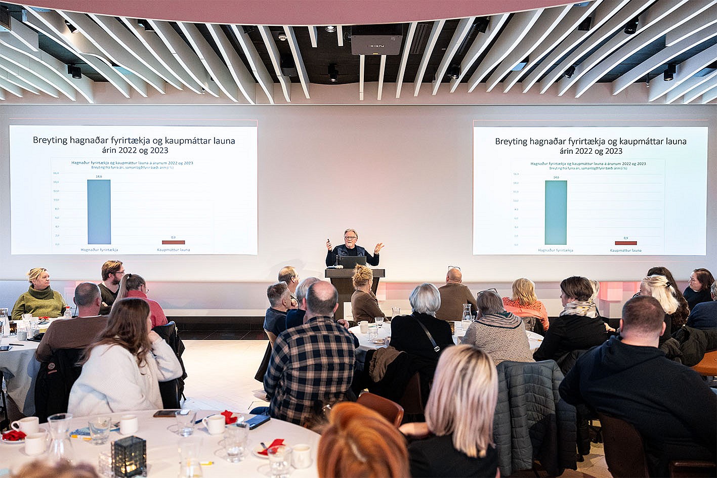 Hann sagði að skuldir íslenska ríkisins væru einar þær lægstu sem þekktust á Vesturlöndum og því væri mikið til skiptanna. Þá hefur ekki verið meiri heildarvelta fyrirtækja síðan 2002 en síðastliðin tvö ár. Hagnaður þeirra var 11,9 prósent af heildarveltu fyrir árið 2022, sem er óvenju mikið.