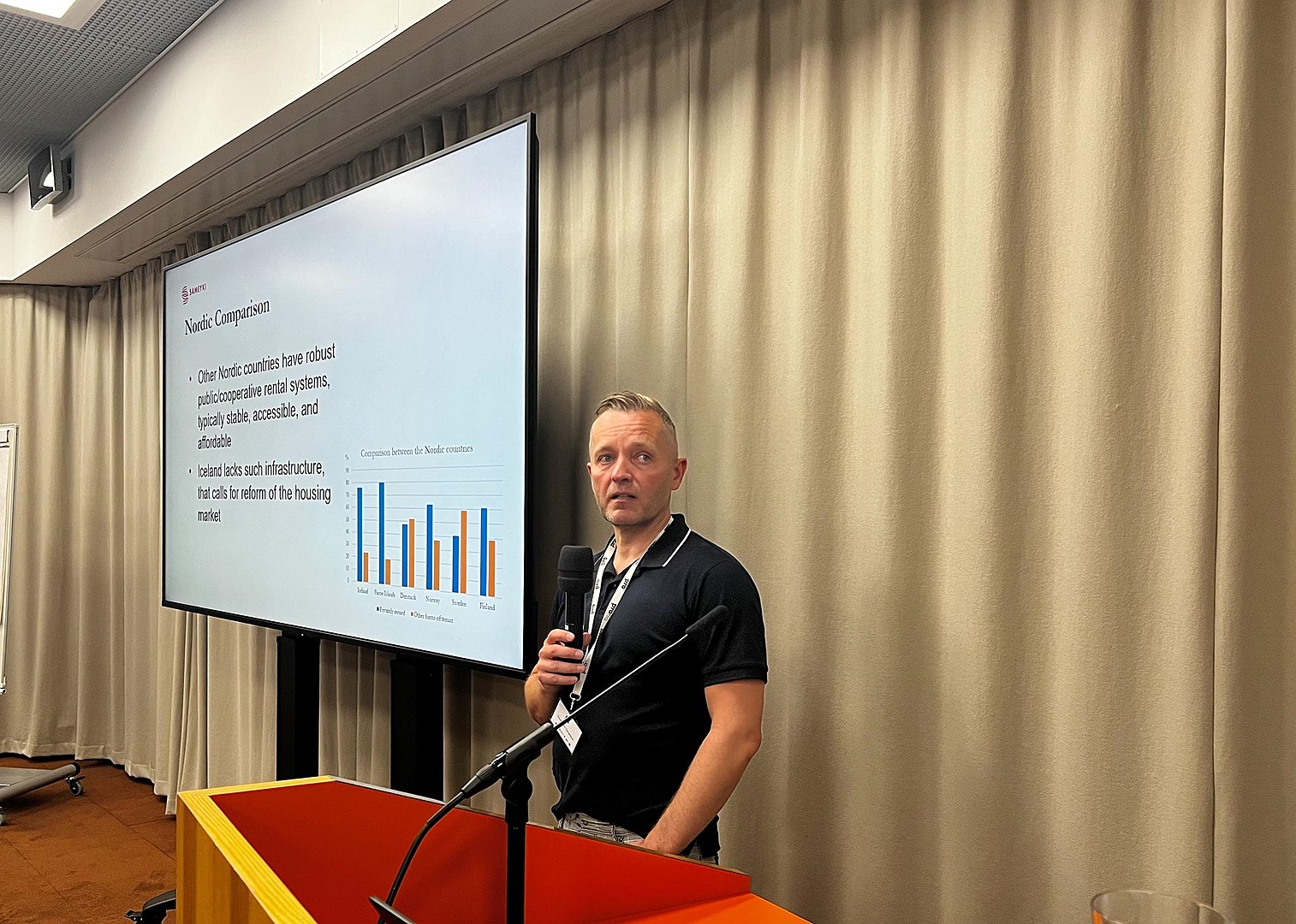 Gunnsteinn R. Ómarsson, framkvæmdastjóri Sameykis, fjallaði um húsnæðismarkaðinn á Íslandi. Hann greindi stuttlega frá sögu húsnæðismarkaðarins frá því að ríkisstjórn Sjálfstæðis- og Framsóknarflokks breytti lögum þess efnis að fólk gat fengið 90% húsnæðislán: „Síðan þá hefur húsnæði hækkað stjórnlaust.“ Gunnsteinn sagði að húsnæðismálin væru í raun stærsta kjaramálið í dag á Íslandi. Þá sagði hann að háir og sveiflukenndir vextir, ásamt viðvarandi verðbólgu hefðu verið að stórum hluta knúin áfram af húsnæðiskostnaði og hefðu ýtt enn frekar undir óstöðugleika á húsnæðismarkaðnum.