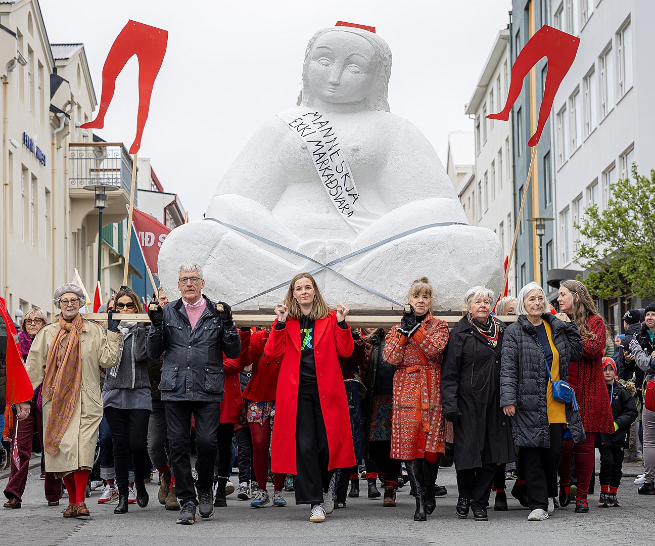 Sonja Ýr Þorbergsdóttir, formaður BSRB, sagði á 1. maí að ofbeldi gegn konum væri ekki minna hér á landi en í þeim löndum sem þjóðin ber sig saman við – Norðurlöndin. Á myndinni er Sonja Ýr ásamt forystufólki verkalýðshreyfingarinnar með líkneski af Venus á herðum sér sem Messíana Tómasdóttir, listakona, teiknaði upprunalega fyrir kröfugönguna árið 1970. Mynd/Kvennaár 2025