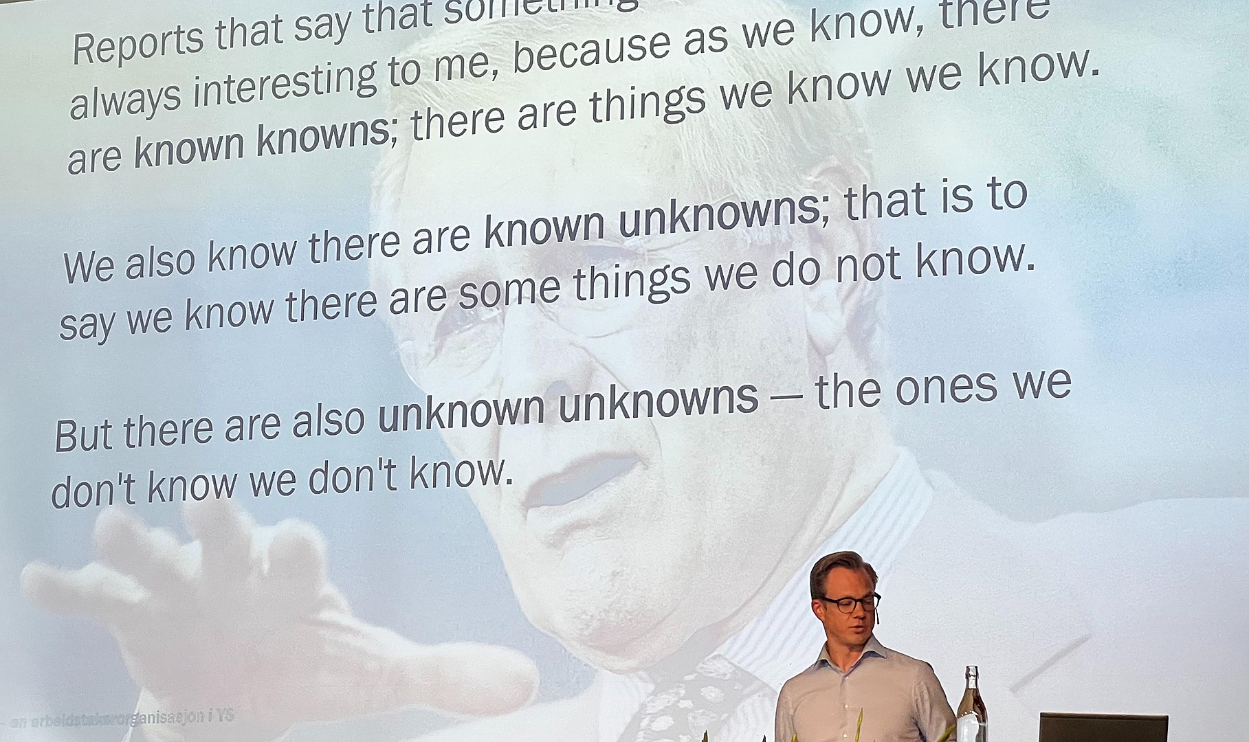 „Donald Rumsfeld fyrrum varnarmálaráðherra Bandaríkjanna hafði ákveðinn hæfileika til að greina og orða ýmsan vanda. Mitt í Íraksstríðinu sagði hann í fjölmiðlum: „Það eru þekktar staðreyndir; það eru hlutir sem við vitum að við vitum. Við vitum líka að það er þekkt óvissa; það er að segja, við vitum að það eru hlutir sem við vitum að við vitum ekki. En það er líka óþekkt óvissa — það sem við vitum ekki að við vitum ekki.“ Það sem gildir um gervigreindina er óvissa um óvissuna um það óþekkta,“ sagði Øystein.
