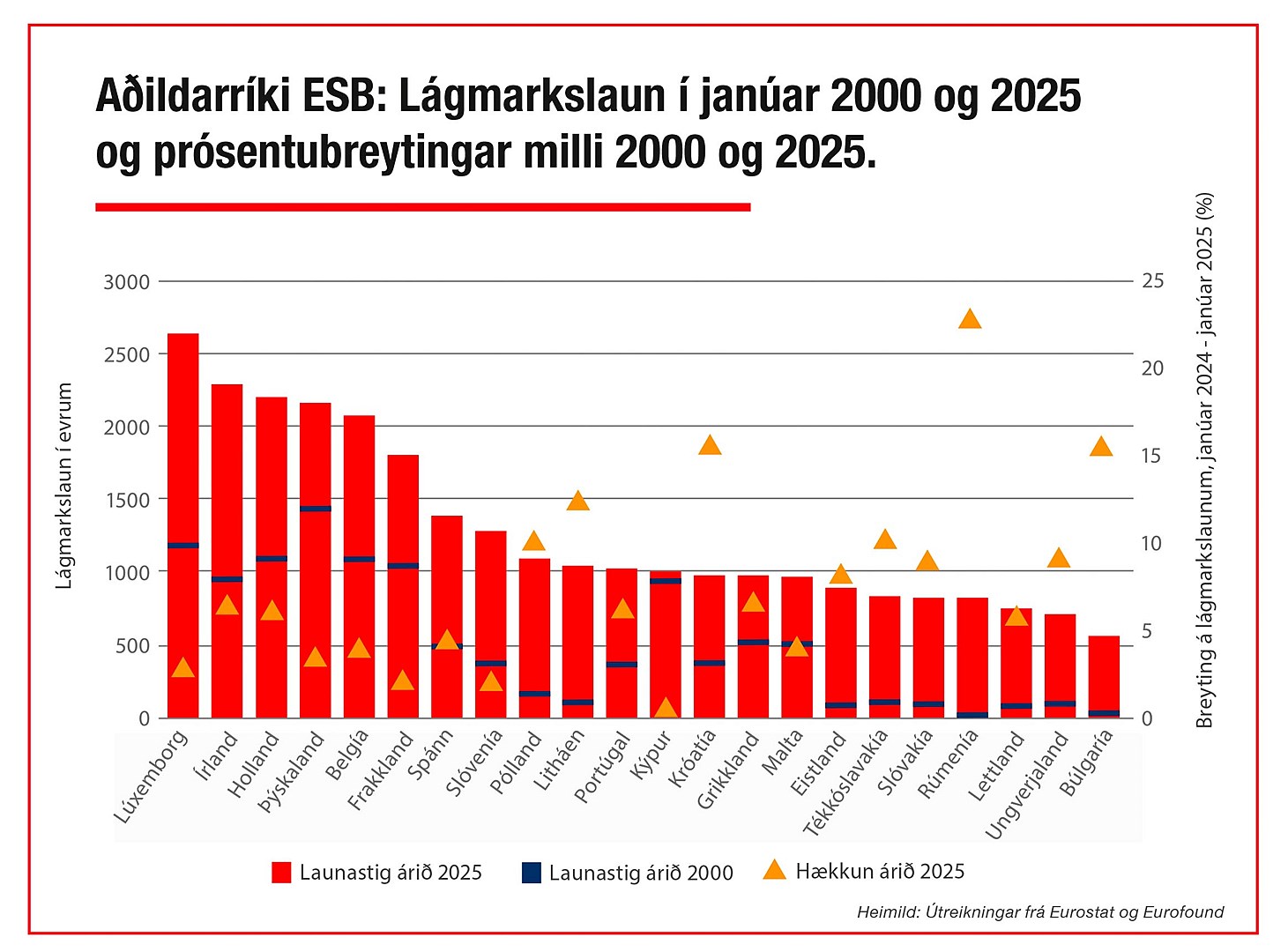 Mynd 1: Lágmarkslaun í janúar 2000 og 2025 og prósentubreytingar milli 2000 og 2025, aðildarríki ESB.