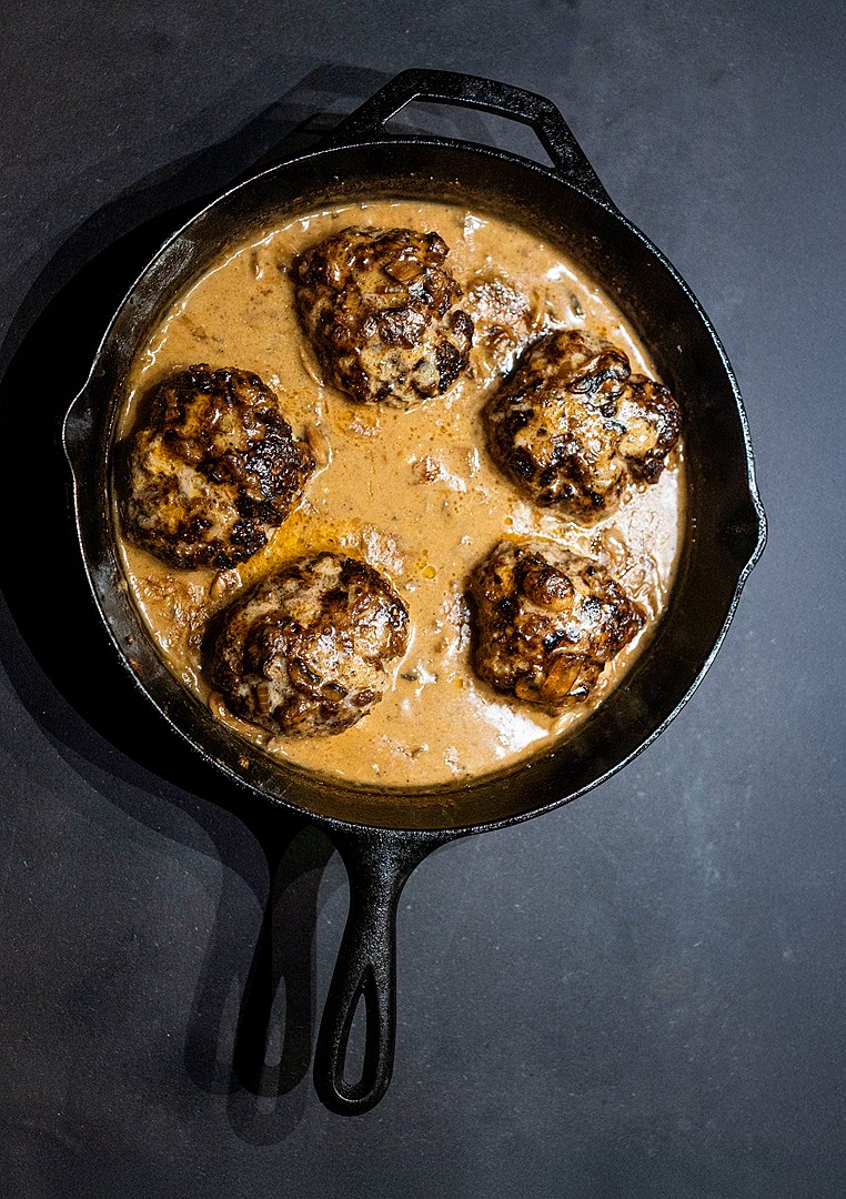 Hakkabuff með lauk og eggi, eins og mörg amman gerði, á sér langa sögu í íslenskri matarmenningu og ætti að vera oftar á matarborðinu. En eins og allar ömmur þekkja er allt er betra í rjómalagaðri brúnsósu og í þessari uppskrift er egginu skipt út fyrir svakalega sósu. Fer sérstaklega vel með kartöflumús og súrum gúrkum eða ömmulegu rauðkáli úr krukku.