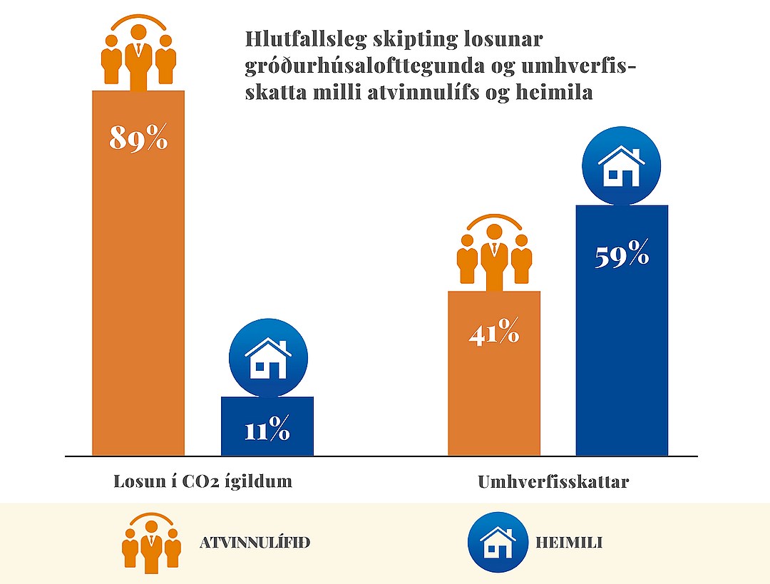 Í nýbirtum gögnum Hagstofu Íslands kemur fram að heimili greiða meirihluta umhverfisskatta á Íslandi eða 59%, sem er eitt hæsta hlutfall í Evrópu. Alls greiddu heimilin um 32 milljarða króna í umhverfisskatta árið 2020 en atvinnulífið og erlendir aðilar um 22 milljarða. Þetta er í engu samræmi við losun gróðurhúsalofttegunda því atvinnulífið á Íslandi ber ábyrgð á tæpum 90% losunar og heimilin 11%.
