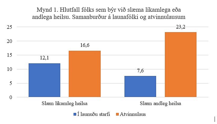 Nýlega framkvæmdi Varða – Rannsóknastofnun vinnumarkaðarins könnun á meðal meðlima aðildarfélaga ASÍ og BSRB. Í gögnunum má finna vísbendingar um áhrif atvinnuleysis á heilsufar. Þannig mátu til dæmis 16,6% atvinnulausra líkamlega heilsu sína slæma, samanborið við 12,1% þeirra sem voru starfandi. Það er öllu meira sláandi að bera saman andlega heilsu þessara hópa. Rúm 23% atvinnulausra mældust með þunglyndiseinkenni á PHQ-9 skalanum samanborið við 7,6% launafólks.