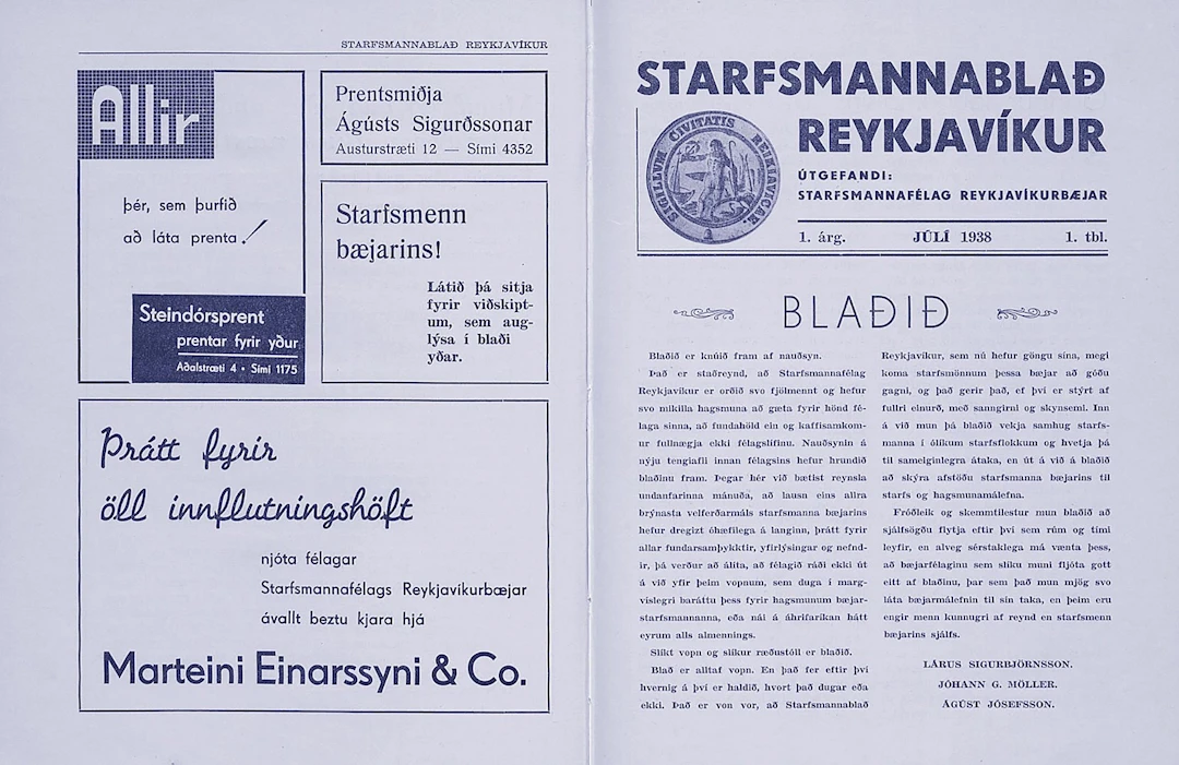 Ein slík Rafha-auglýsing birtist á forsíðu fyrsta Starfsmannablaðs Reykjavíkur sumarið 1938. Það kom ekki á óvart, því einn helsti forsprakki Rafha var Nikulás Friðriksson, eftirlitsmaður hjá Rafmagnsveitunni, formaður Starfsmannafélags Reykjavíkur um árabil og stjórnarmaður í BSRB. Í auglýsingunni var því haldið fram að framtíðartekjur Reykjavíkurbæjar færu beinlínis eftir því að Rafha-eldavélar yrðu settar í hvert eldhús. Saklaus auglýsing – en hún hittir í raun naglann á höfuðið þegar kemur að sögu Starfsmannafélagsins á fyrstu áratugunum. Ólíkt mörgum stéttarfélögum, sem byggja sjálfsmynd sína á átökum við atvinnurekendur, varð Starfsmannafélag Reykjavíkur til við allt aðrar aðstæður. Eftir hótun Símamannafélagsins um verkfall árið 1916 – sem dugði til að knýja fram launahækkanir – brást ríkisvaldið harkalega við. Opinberum starfsmönnum voru með lögum bannaðar verkfallsaðgerðir og kjör þeirra ákveðin einhliða af ríki og sveitarfélögum. Þar með voru opinberir starfsmenn settir í allt annað umhverfi en almennt launafólk.