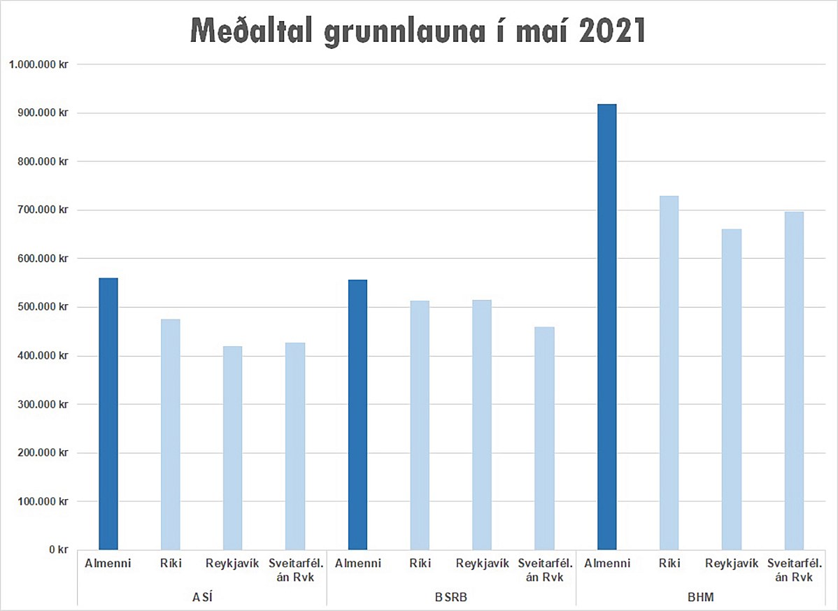 Þó að á myndinni séu aðeins grunnlaun sýna sambærilegar myndir með meðaltali reglulegra launa annars vegar og reglulegra heildarlauna hins vegar nákvæmlega sömu stöðu. Hvernig sem málið er skoðað eru launin alltaf hæst á almenna markaðinum.