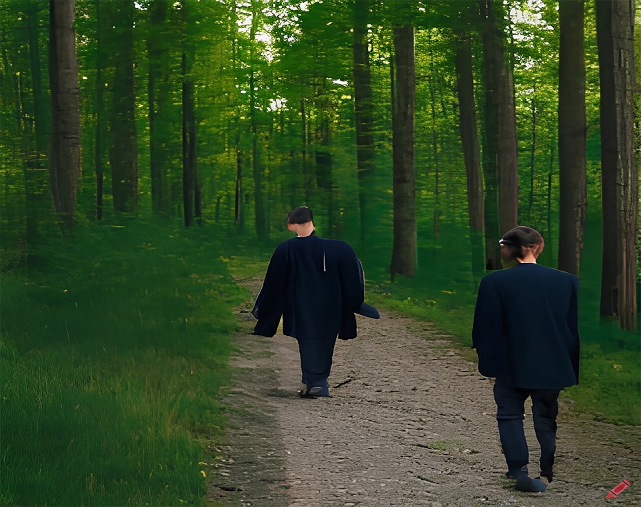 Maður hittir annan mann sem er klæddur í leðurfrakka úti í skógi. Ljósmynd búin til af gervigreinarforriti.