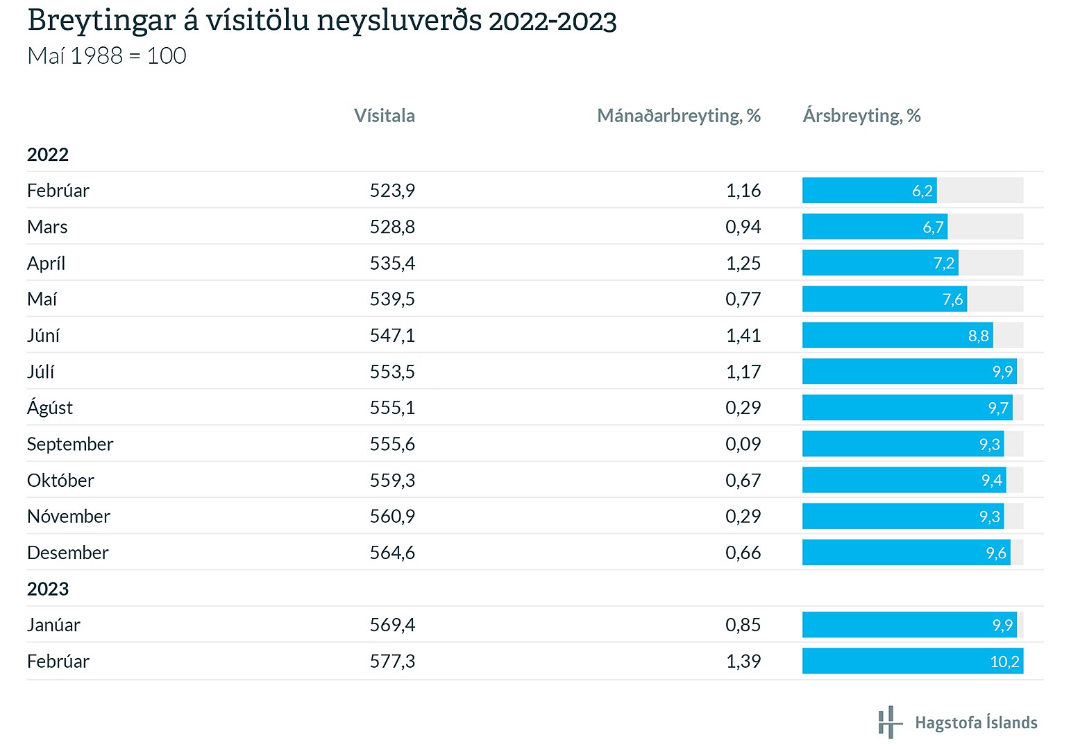 Vísitala neysluverðs, miðuð við verðlag í febrúar 2023 hækkar um 1,39% frá fyrri mánuði. Vísitala neysluverðs án húsnæðis hækkar um 1,81% frá janúar 2023. Verð á mat- og drykkjarvörum hækkaði um 1,9% og verð á fötum og skóm hækkaði um 6,8%. Verð á húsgögnum, heimilisbúnaði o.fl. hækkaði um 8,7%.