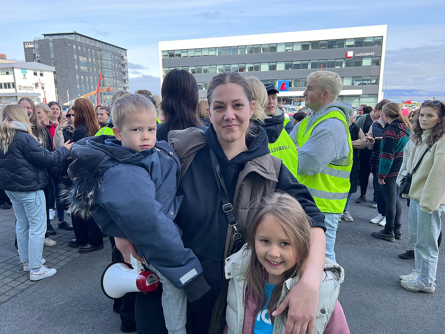 „Ég á líka eina þriggja vikna sem mun vonandi komast inná leikskóla haustið 2024. Í störfum fólks á leikskólum er rútína yfir daginn þar sem börnin njóta sín vel í rútínunni og finna fyrir öryggi. Þar er þeim kennd félagsleg hæfni, læra að leika sér með vinum sínum o.s.frv. Þetta starfsfólk er ómissandi, er í ómissandi störfum. Það er með gott og notalegt viðmót og hefur gaman af því að kenna börnum, sinna daglegum athöfnum þeirra og dansa með þeim og syngja, skeina þeim, þvo hendur þeirra, gefa þeim að borða. Börn verða líka óörugg þegar það er mikil starfsmannavelta. Við vitum að starfsmannavelta orsakast að hluta til af óánægðu starfsfólki vegna launamisréttis og álagas í vinnu. Einnig ættu launin auðvitað að hækka í samræmi við verðbólgu. Semjið strax fyrir okkar framtíðar kynslóðir,“ sagði Erla Þórdís.