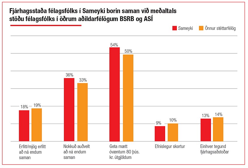 Þegar fjárhagsstaða félagsfólks Sameykis er borin saman við meðaltalsstöðu félagsfólks í öðrum aðildarfélögum BSRB og ASÍ á svipað hlutfall erfitt eða mjög erfitt með að ná endum saman (18% á móti 19%) og hærra hlutfall á nokkuð auðvelt með að ná endum saman (36% á móti 33%). Hærra hlutfall Sameykisfólks gæti mætt óvæntum 80.000 kr. útgjöldum án þess að stofna til skuldar (54% á móti 50%). Einnig býr lægra hlutfall við efnislegan skort (9% á móti 10%) og hefur þurft á einhvers konar fjárhagsaðstoð að halda á síðastliðnu ári (13% á móti 14%).