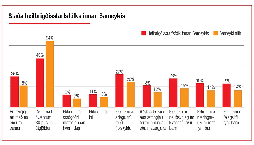 Um fjórðungur (25%) þeirra sem starfa við heilbrigðisþjónustu innan Sameykis á erfitt eða mjög erfitt með að ná endum saman og ríflega helmingur (53%) gæti ekki mætt óvæntum 80.000 kr. útgjöldum án þess að stofna til skuldar. Ríflega einn af hverjum tíu (10%) hefur ekki efni á staðgóðri máltíð annan hvern dag og nánast sama hlutfall (11%) hefur ekki efni á bíl. Meira en fjórðungur hefur ekki efni á árlegu fríi með fjölskyldu sinni (27%). Tæpur fimmtungur (18%) hefur þurft að fá aðstoð frá vinum eða ættingjum í formi peninga- eða matargjafa á síðastliðnu ári. Verri fjárhagsstaða foreldra sem eru félagar í Sameyki og starfa í heilbrigðisþjónustu birtist einnig þegar litið er til kostnaðarsamra þátta sem fylgja því að vera með börn á heimili. Tæplega fjórðungur (23%) þeirra hefur til að mynda ekki getað keypt nauðsynlegan klæðnað fyrir börnin sín, tæplega fimmtungur (19%) hefur ekki haft efni á eins næringarríkum mat og þau telja börnin sín þurfa og sama hlutfall (19%) hefur ekki getað greitt kostnað vegna félagslífs barna sinna, eins og að fara í bíó með vinum eða í afmæli til vina.