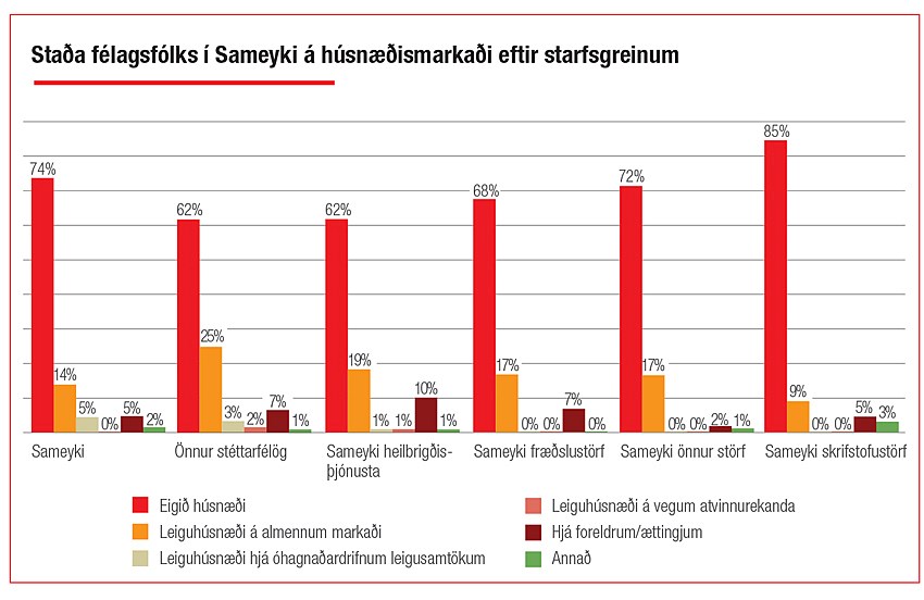 Staða launafólks á húsnæðismarkaði hefur mikil áhrif á lífskjör þess og niðurstöður kannana Vörðu hafa ítrekað sýnt að þeir hópar sem búa við verri fjárhagsstöðu eru að sama skapi í meiri mæli á hinum almenna leigumarkaði þó að niðurstöðurnar segi ekki til um orsakasamhengið. Þegar staða félagsfólks Sameykis á húsnæðismarkaði er greind sést að hærra hlutfall er í eigin húsnæði (74% á móti 62%) og lægra hlutfall í leiguhúsnæði á almennum leigumarkaði (14% á móti 25%) samanborið við annað félagsfólk í aðildarfélögum BSRB og ASÍ. Meðaltalstölurnar gefa þó ekki rétta mynd af stöðu ólíkra hópa. Nokkur munur sést á stöðu félagsfólks Sameykis á húsnæðismarkaði eftir því í hvaða starfsgreinum það starfar. Lægst er hlutfall þeirra sem starfa í heilbrigðisþjónustu og búa í eigin húsnæði (62%), næstlægst meðal þeirra sem eru í fræðslustörfum (68%), því næst meðal þeirra sem eru í öðrum störfum (72%) en langhæst hjá félagsfólki í skrifstofustörfum (85%). Að sama skapi er hæst hlutfall félagsfólks í heilbrigðis-þjónustu sem er á almennum leigumarkaði (19%), því næst í fræðslustarfsemi (17%) og öðrum störfum (17%) en lægst meðal þeirra sem eru í skrifstofustörfum (9%).