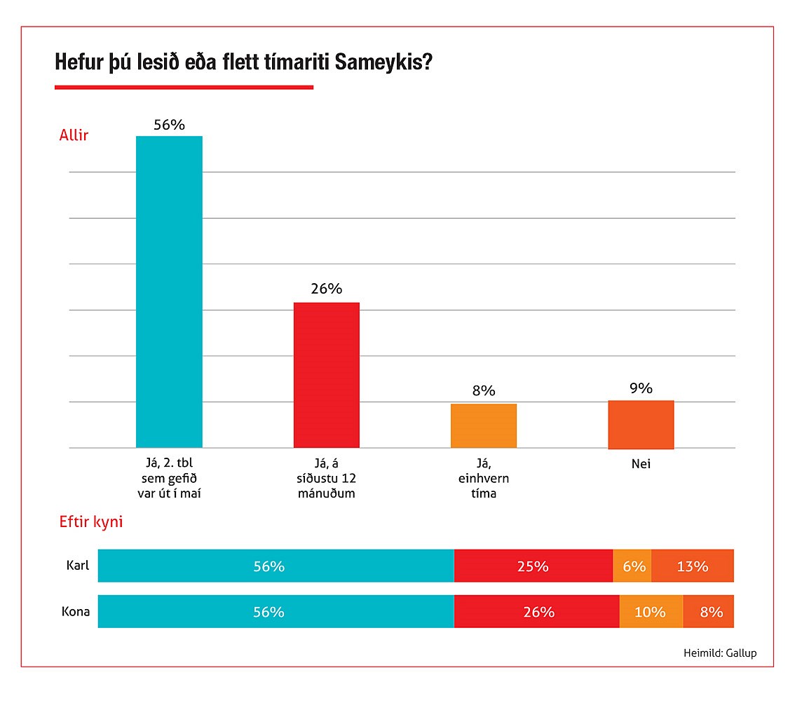 Í könnun Gallup á lestri tímarits Sameykis kemur fram að 56 prósent félagsfólks las tímaritið sem kom út í maí sl. 26 prósent lásu tímartið síðustu tólf mánuði og 8 prósent hafa einhverntíma lesið það, en 9 prósent þeirra sem tóku þátt í könnuninni hafa ekki lesið tímaritið. Samtals hafa því 90 prósent lesið tímaritið á því tímabili sem spurt var um.