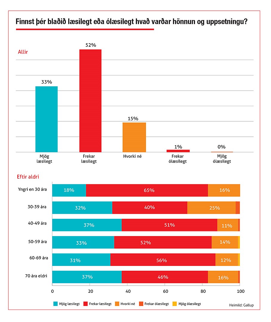 Þegar spurt var hversu læsilegt félagsfólki þótti tímaritið vera, svöruðu 85 prósent það vera mjög læsilegt eða frekar læsilegt, en 15 prósent hvorki né læsileg. Eftir kyni svöruðu 98 prósent karla það vera mjög læsilegt eða frekar læsilegt, og 87 prósent kvenna sögðu það vera mjög læsilegt eða frekar læsilegt. Yngri en 30 ára sögðu 83 prósent það vera mjög læsilegt eða frekar læsilegt, og félagsfólk á aldrinum 30-39 ára sögðu 72 prósent það vera mjög læsilegt eða frekar læsilegt.