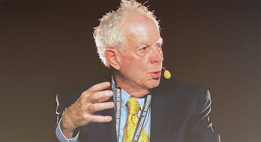 Harris Gleckman, sérfræðingur við miðstöð um stjórnarhætti og sjálfbærni við háskólann í Massachusetts og fyrrverandi yfirmaður skrifstofu um viðskipti og efnhagslega þróun, UNCTAD, sagði á þinginu í dag að við lifum á tímum alþjóðavæðingar þar sem einkafyrirtæki sækja af miklum krafti í að fá að reka opinbera þjónustu. Stjórnmálin og stjórnmálafólk, bankar og kapítalisminn sem er drifkraftur þessa sjá tækifæri í „áskrift“ af peningum sem fylgir því að reka opinbera þjónustu.