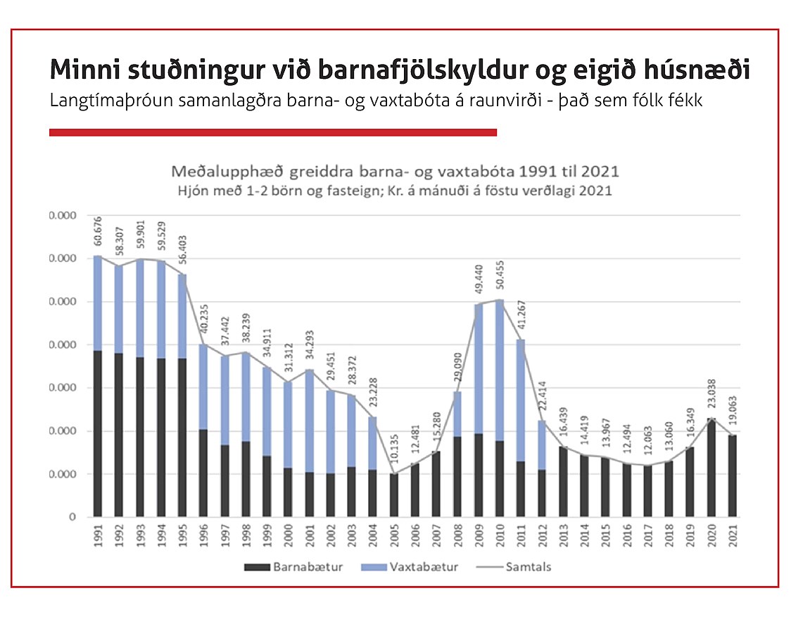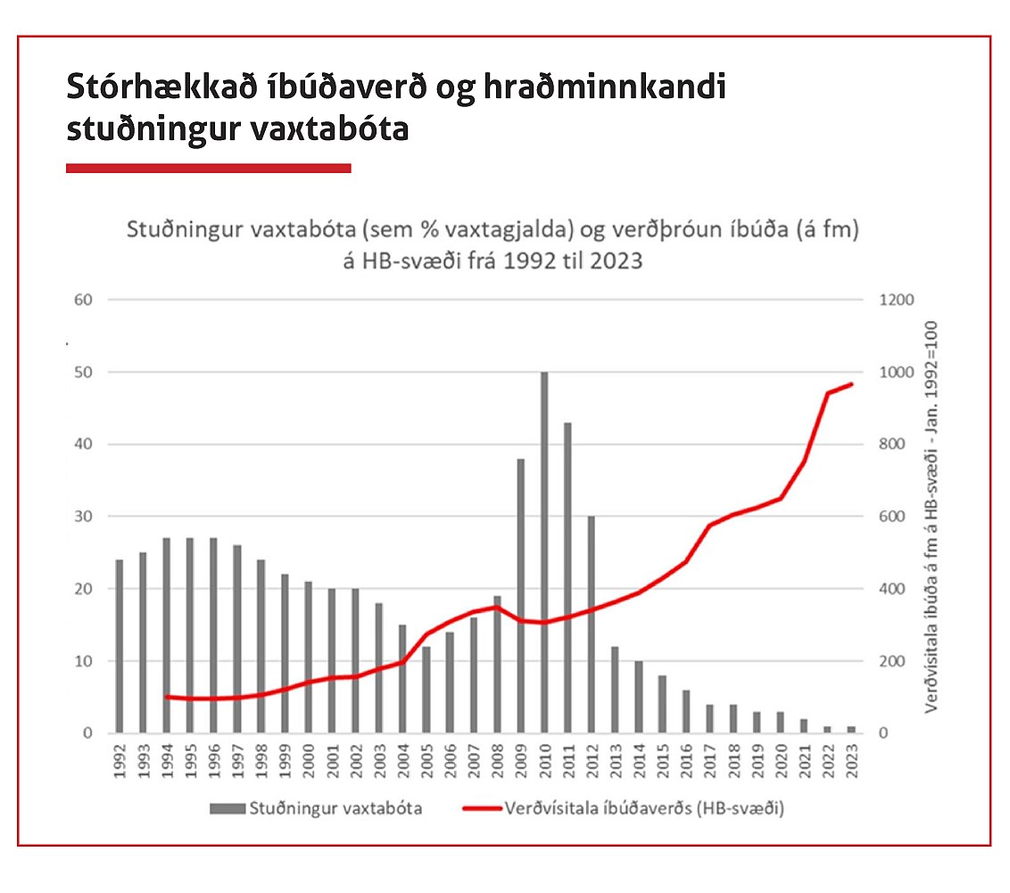 „Rauða línan sýnir þróun íbúðaverðs. Það er auðvitað þessi þróun á húsnæðismarkaði sem setur stórt strik í erfiðleika launafólks. Mjög mikil hækkun íbúðaverðs þýðir að fólk þarf að skuldsetja sig miklu meira en áður til að kaupa sér húsnæði. Svo þegar Seðlabankinn kemur með þessar stýrivaxtahækkanir þá er það gríðarlega þungur baggi fyrir ungt fólk og ungar barnafjölskyldur sem eru að stofna heimili. Þessar stýrivaxtahækkanir lenda auðvitað á heimilunum í landinu. Á sama tíma hefur vaxtabótakerfið hrunið sem hefur verið eitt helsta stuðningskerfi fólks til að geta keypt sér húsnæði.