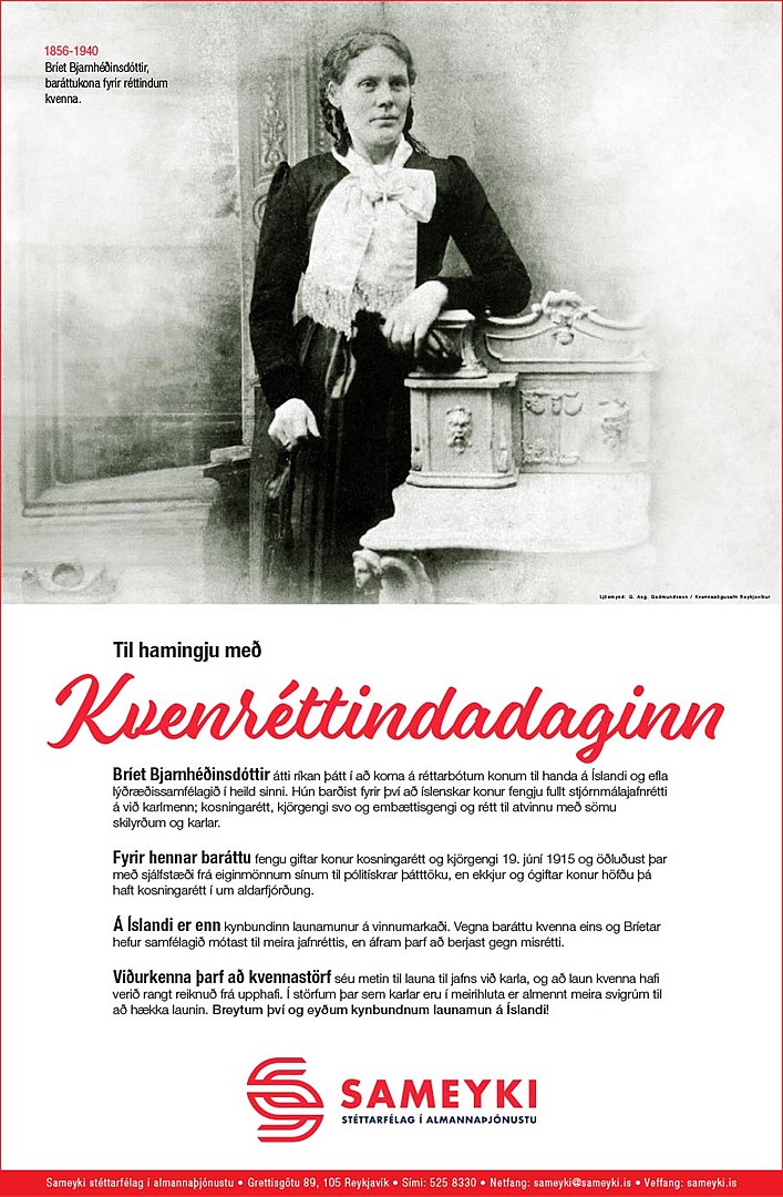 Bríet Bjarnhéðinsdóttir átti ríkan þátt í að koma á réttarbótum konum til handa á Íslandi og efla lýðræðissamfélagið í heild sinni. Hún barðist fyrir því að íslenskar konur fengju fullt stjórnmálajafnrétti á við karlmenn; kosningarétt, kjörgengi svo og embættisgengi og rétt til atvinnu með sömu skilyrðum og karlar. Fyrir hennar baráttu fengu giftar konur kosningarétt og kjörgengi 19. júní 1915 og öðluðust þar með sjálfstæði frá eiginmönnum sínum til pólitískrar þátttöku, en ekkjur og ógiftar konur höfðu þá haft kosningarétt í um aldarfjórðung.