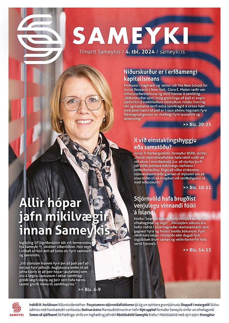 Formaður Sameykis, Ingibjörg Sif Sigríðardóttir, er í forsíðuviðtali og segir að leiðarljós Sameykis sé ávallt félagsfólkið. Hún muni beita sér fyrir samstarfi og samstöðu í baráttunni fyrir betri kjörum og að verja áunnin réttindi, sérstaklega hjá þeim hópum sem eru á lægstu laununum, ekki aðeins bættum kjörum heldur réttum kjörum. Þá segir hún skipta máli að beita sér í verkalýðspólitíkinni, hvernig auðnum sé skipt með réttlátum hætti því launafólk skapi verðmætin.