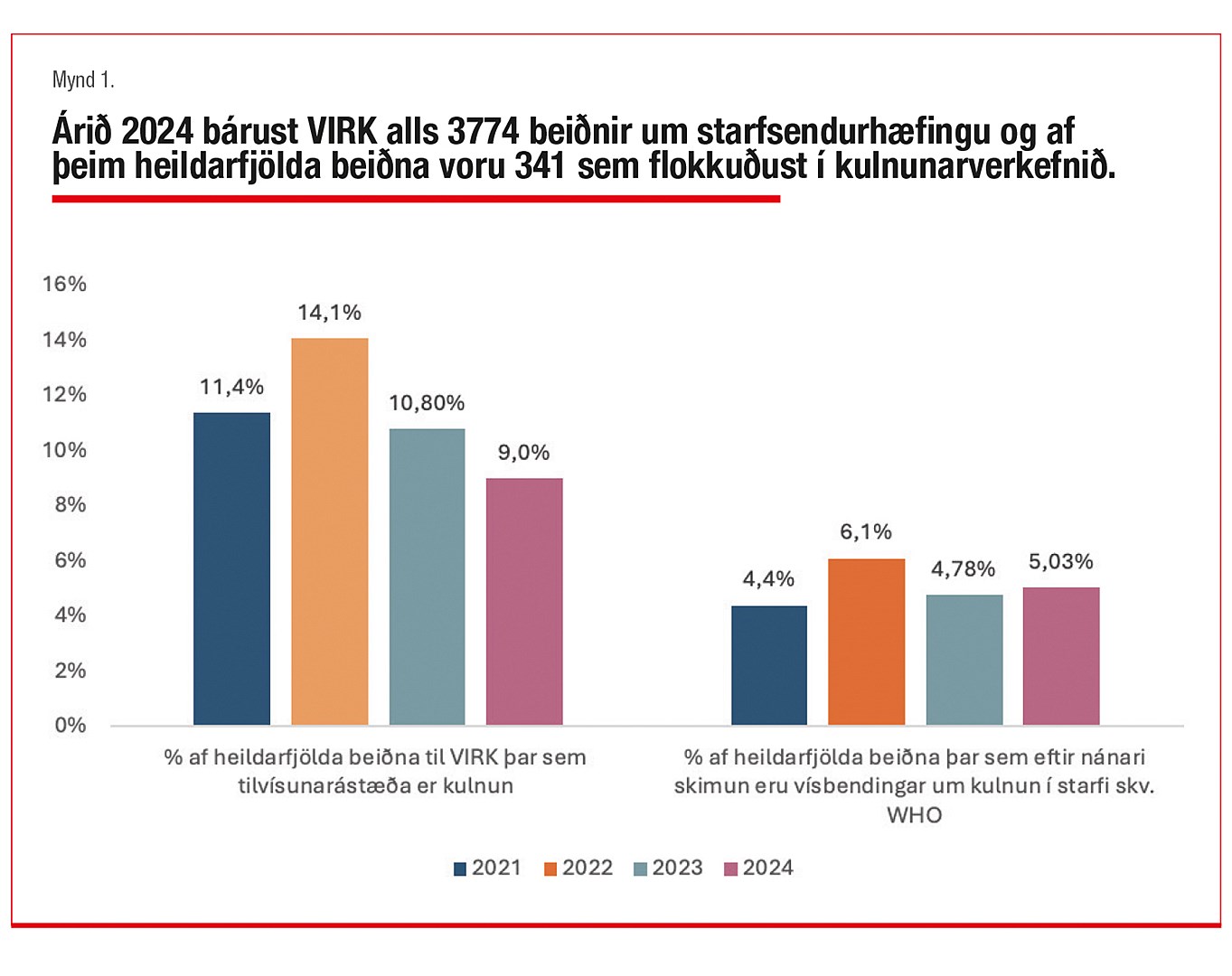 Árið 2024 bárust VIRK alls 3774 beiðnir um starfsendurhæfingu og af þeim heildarfjölda beiðna voru 341 sem flokkuðust í kulnunarverkefnið. Eftir nánari skoðun sérfræðinga hjá VIRK uppfylltu 5% af heildarfjölda beiðna sem bárust VIRK viðmið WHO fyrir kulnun í starfi. Á þessum tímapunkti hefur VIRK safnað tölfræði yfir fjögur almanaksár eða frá árinu 2021 til 2024 (sjá mynd 1).