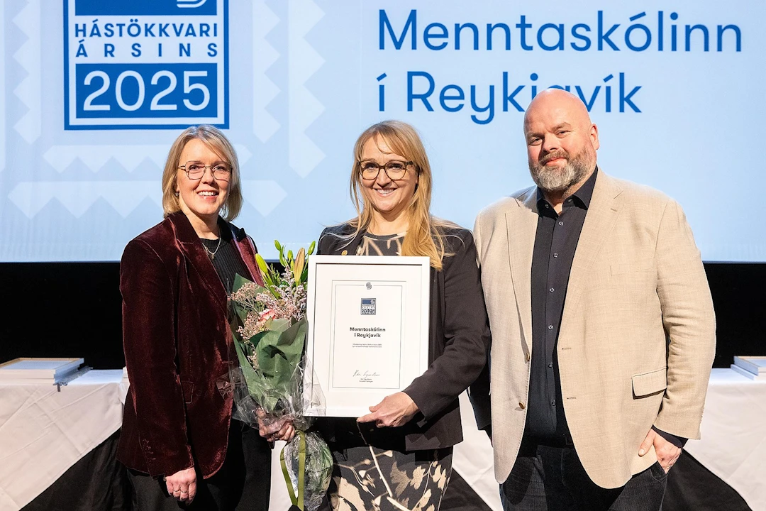 Sólveig Guðrún Hannesdóttir, rektor Menntaskólans í Reykjavík ásamt varaformanni og formanni Sameykis. Menntaskólinn í Reykjavík var hástökkvari í Stofnun ársins í flokknum ríki.