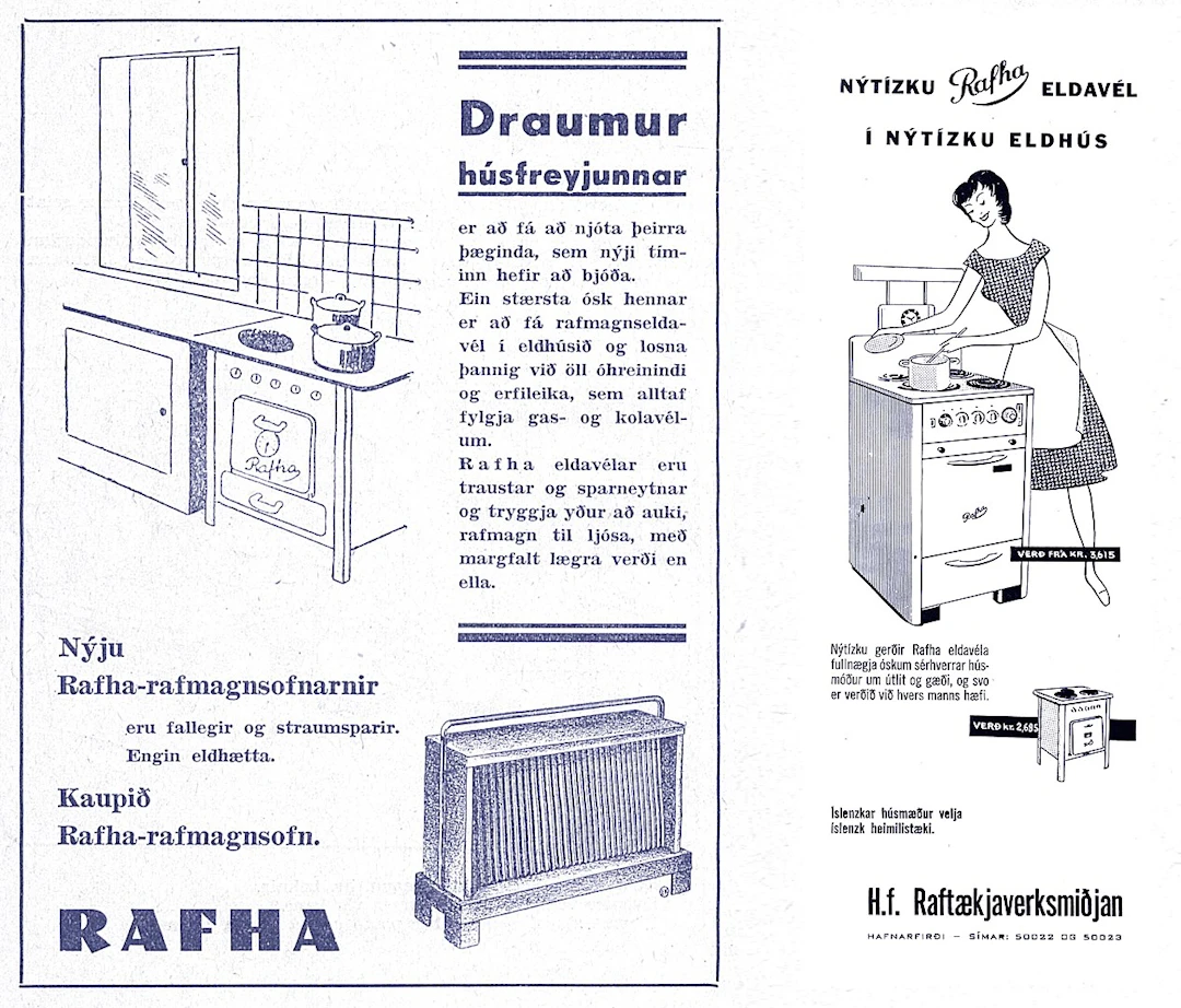Árið 1936 var nýtt fyrirtæki stofnað á Íslandi: Raftækjaverksmiðjan í Hafnarfirði, Rafha. Markmiðið var að framleiða rafmagnstæki fyrir íslensk heimili og nýta raforku hinnar væntanlegu Ljósafossvirkjunar. Fyrirtækið naut ríkulegrar fyrirgreiðslu hins opinbera, meðal annars í formi tollverndar, og lagði sitt af mörkum til að gera rafmagn að daglegum veruleika fólks – meðal annars með því að bjóða rafmagnstæki á afborgunum, líklega í fyrsta sinn hér á landi. Auglýsingar Rafha voru eftirminnilegar og spegluðu tíðarandann vel. Í einni þeirra var boðskapurinn skýr: „Hyggin húsmóðir“ vildi spara vinnu, „hygginn húsbóndi“ vildi spara peninga.