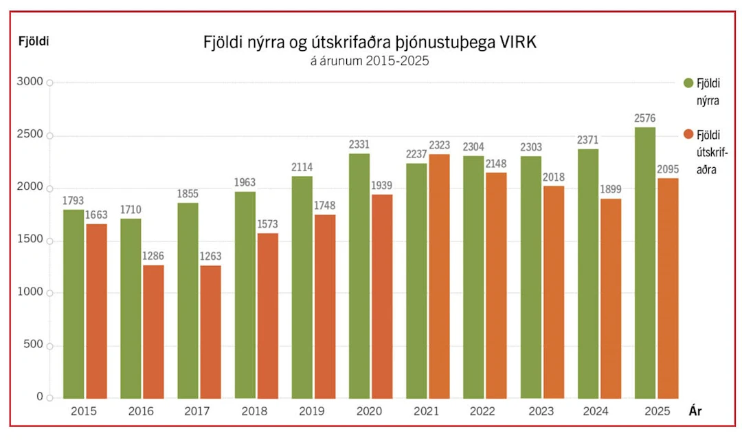 Árið 2025 var metár hjá VIRK: 2.576 hófu starfsendurhæfingu, 205 fleiri en árið áður (+8,6% frá 2024).