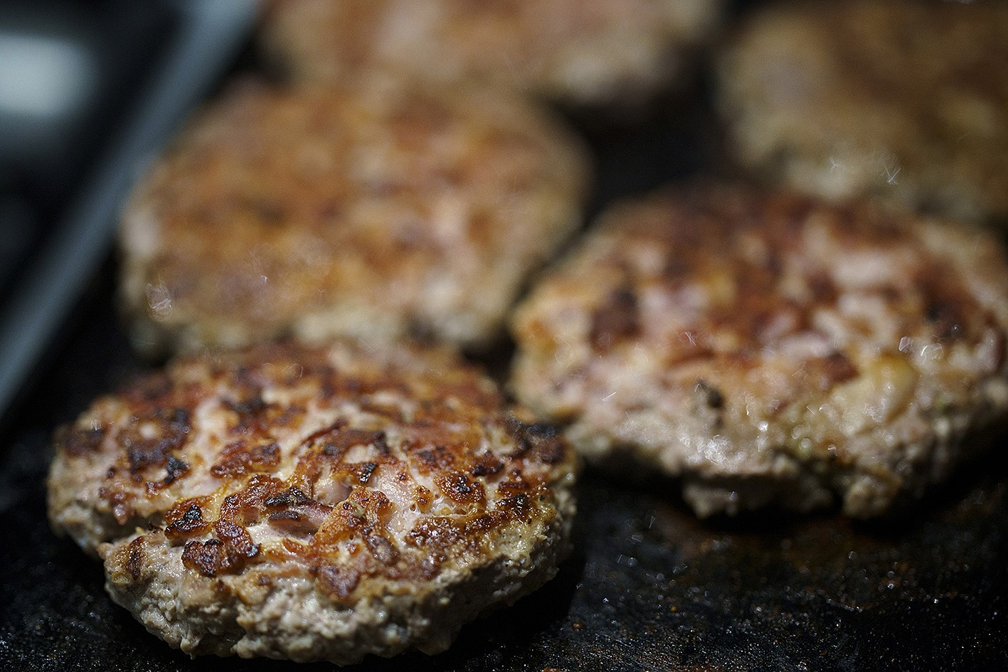 Næsta skref er að móta platta. Þessir plattar mega vera sæmilega þykkir og stórir. Rúmlega 150 grömm hver. Þeir munu minnka örlítið við eldun. Næst er að skera beikon niður í litla bita eða jafnvel bara kaupa kurl. Þrýsta því svo undir annan helminginn. Steikja herlegheitin svo á rétt rúmlega meðalheitri pönnu, fyrst með beikonhliðina niður til að mynda skorpu. Á meðan kryddum við topphliðina aðeins meira – en bara með ferskmöluðum pipar og salti. Munum þó með saltið að það fór salt í farsið og beikon er brimsalt. Ef þetta eru þykkir plattar taka þeir þó vel við salti.Steikja svo á „kryddhliðinni“. Séu þetta svo sæmilega þykkir gaurar er um að gera að steikja tvisvar á hvorri hlið. Kjöthitamælir heimilisins þarf svo að skríða yfir 70 gráður á celsíus. Ef enginn er kjötmælirinn er um að gera að steikja plattann bara nógu skrambi lengi. Alifuglahakk er úr brúnu kjötdeildinni og tekur lengi og vel við hita án þess að þorna alveg upp.