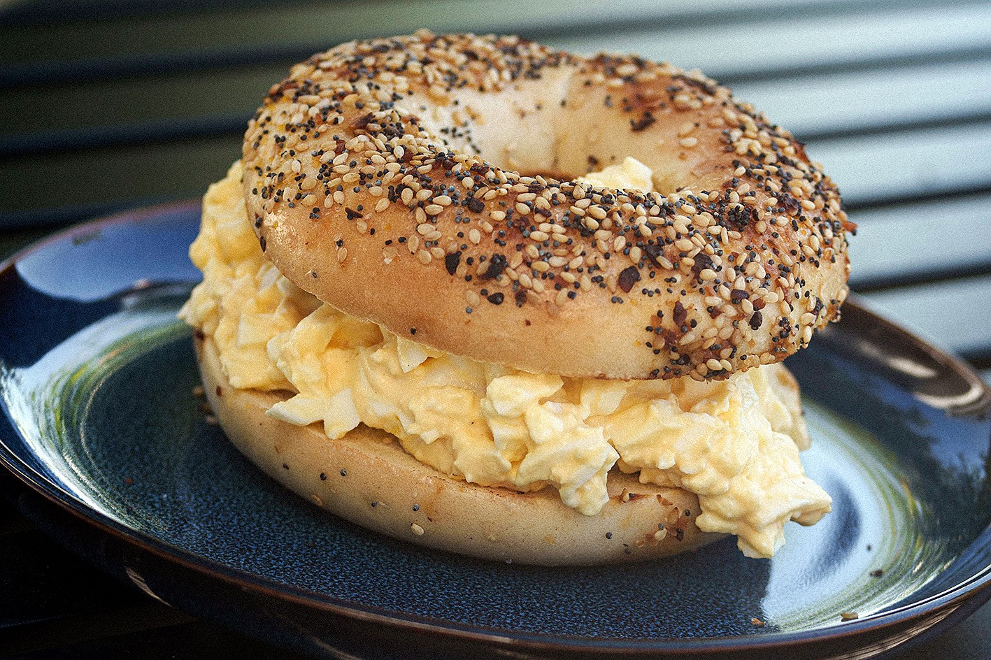Næst er að hræra mæjónesi út í eggin. Sirka þremur sæmilega kúfuðum matskeiðum á móti sex eggjum. Þá fer edikblandaður laukurinn út í og krydd. Hálf teskeið af salti eða eftir smekk og einn þriðji af hvítum pipar. Sama magn af hvítlauksdufti. Gott að flækja ekki grunnuppskriftina um of en auðvitað hægt að bæta út í alls konar kryddi og jurtum. Að síðustu fara nokkrar slettur af eldpiparsósu eða góðu Dijon-mæjónesi. Hræra vel saman og þá er allt klárt og ekkert eftir nema að rista beyglu eða hvítasta brauð hússins.