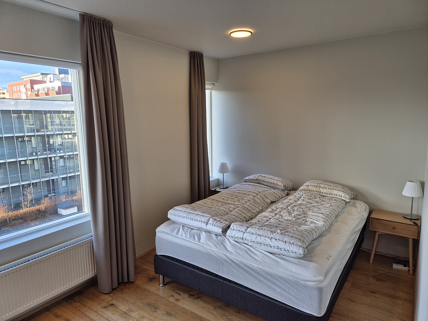 Í svefnherbergi er tvíbreytt rúm 160x200 og svefnsófi í stofu er 140x200 að stærð. Eitt ferðabarnarúm ásamt barnastól er í íbúðinni.