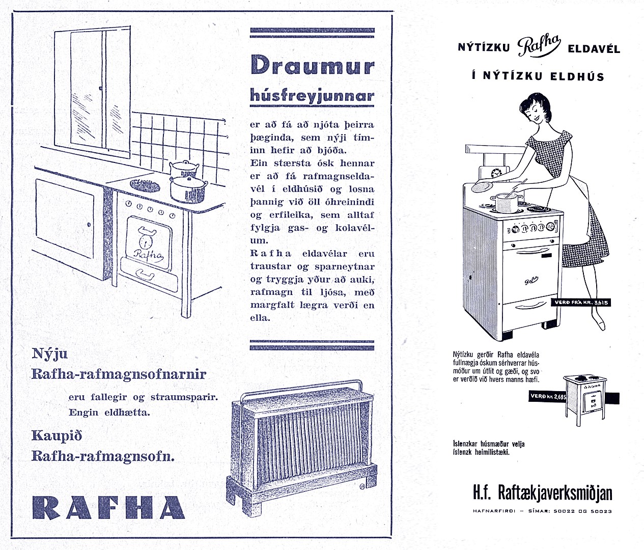 Árið 1936 var nýtt fyrirtæki stofnað á Íslandi: Raftækjaverksmiðjan í Hafnarfirði, Rafha. Markmiðið var að framleiða rafmagnstæki fyrir íslensk heimili og nýta raforku hinnar væntanlegu Ljósafossvirkjunar. Fyrirtækið naut ríkulegrar fyrirgreiðslu hins opinbera, meðal annars í formi tollverndar, og lagði sitt af mörkum til að gera rafmagn að daglegum veruleika fólks – meðal annars með því að bjóða rafmagnstæki á afborgunum, líklega í fyrsta sinn hér á landi. Auglýsingar Rafha voru eftirminnilegar og spegluðu tíðarandann vel. Í einni þeirra var boðskapurinn skýr: „Hyggin húsmóðir“ vildi spara vinnu, „hygginn húsbóndi“ vildi spara peninga.