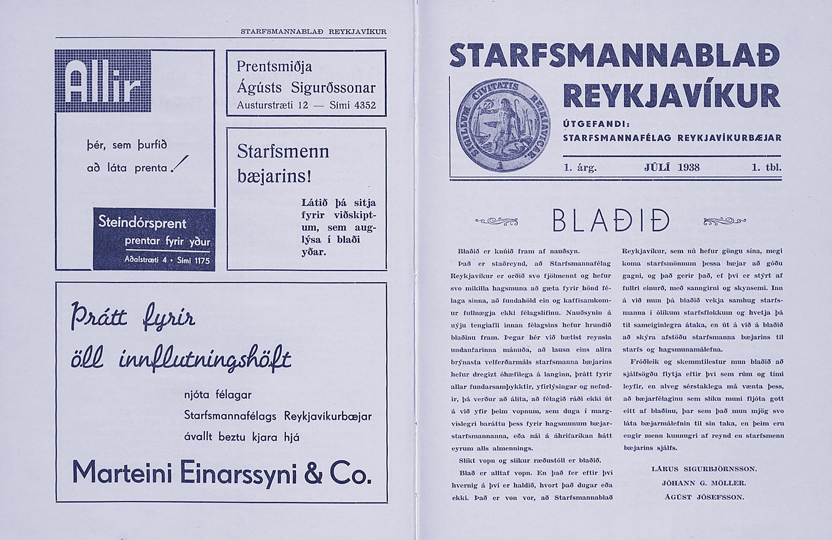 Ein slík Rafha-auglýsing birtist á forsíðu fyrsta Starfsmannablaðs Reykjavíkur sumarið 1938. Það kom ekki á óvart, því einn helsti forsprakki Rafha var Nikulás Friðriksson, eftirlitsmaður hjá Rafmagnsveitunni, formaður Starfsmannafélags Reykjavíkur um árabil og stjórnarmaður í BSRB. Í auglýsingunni var því haldið fram að framtíðartekjur Reykjavíkurbæjar færu beinlínis eftir því að Rafha-eldavélar yrðu settar í hvert eldhús. Saklaus auglýsing – en hún hittir í raun naglann á höfuðið þegar kemur að sögu Starfsmannafélagsins á fyrstu áratugunum. Ólíkt mörgum stéttarfélögum, sem byggja sjálfsmynd sína á átökum við atvinnurekendur, varð Starfsmannafélag Reykjavíkur til við allt aðrar aðstæður. Eftir hótun Símamannafélagsins um verkfall árið 1916 – sem dugði til að knýja fram launahækkanir – brást ríkisvaldið harkalega við. Opinberum starfsmönnum voru með lögum bannaðar verkfallsaðgerðir og kjör þeirra ákveðin einhliða af ríki og sveitarfélögum. Þar með voru opinberir starfsmenn settir í allt annað umhverfi en almennt launafólk.