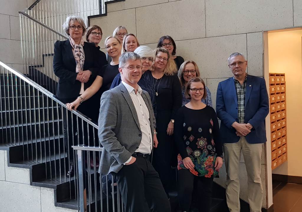 Á myndinni má sjá hluta af fulltrúum í samráðshópnum en þeir komu frá Háskóla Íslands (frá Heilbrigðisvísindasviði og Félagsvísindasviði auk miðlægrar stjórnsýslu), Félagi íslenskra læknaritara, Fjölbrautaskólanum við Ármúla, Fræðslumiðstöð atvinnulífsins, Heilbrigðistofnun Vesturlands, Landspítala og SFR stéttarfélagi. Hópurinn hittist í gær til að fara yfir vinnuna og hvernig kynna á námið.