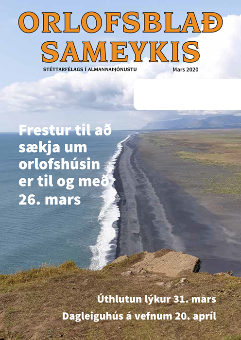 Orlofsblaði Sameykis er komið í póst til félagsmanna. Í blaðinu eru kynntir allir þeir orlofskostir sem standa félagsmönnum til boða og leiðbeiningar fyrir þá sem vilja bóka hús eða sækja um sumarúthlutun. Frestur til að sækja um orlofshús í sumar innanlands er til og með 26. mars.