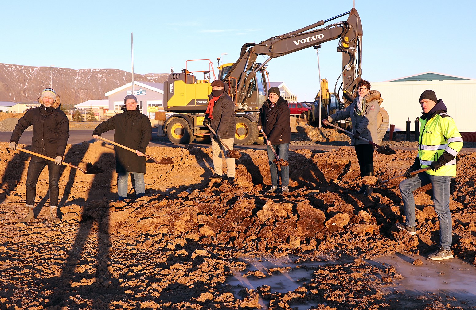 Fyrsta skóflustungan tekin í sólríkri norðan átt. Frá vinstri: Björn Traustason, framkvæmdastjóri Bjargs, Tómas Ellert Tómasson, yfirverkfræðingur hjá SG húsum, Gísli Halldór Halldórsson, bæjarstjóri, Árni Stefán Jónsson, formaður Sameykis og stjórnarformaður Bjargs, Halldóra S. Sveinsdóttir, formaður Bárunnar og Baldur Pálsson, framkvæmdastjóri SG húsa.