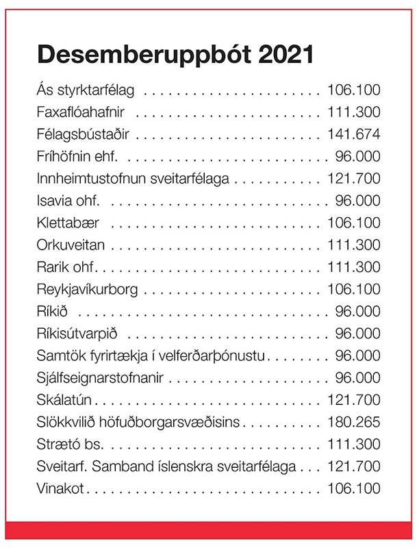Starfsmaður sem er í starfi fyrstu viku nóvembermánaðar fær greidda desemberuppbót miðað við fullt starf tímabilið frá 1. janúar til 31. október. Desemberuppbót er föst krónutala og tekur ekki hækkunum samkvæmt öðrum ákvæðum kjarasamningsins og skal hún greidd út eigi síðar en 15. desember 2021.