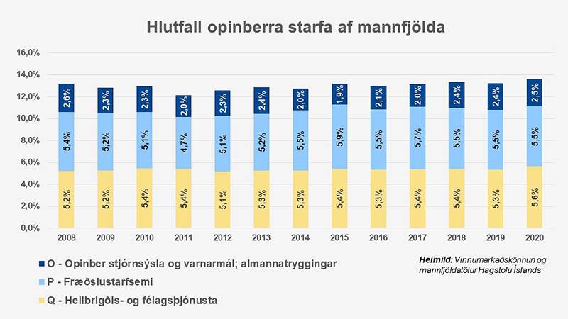 Þegar fjöldi opinberra starfsmanna er skoðaður í samhengi við fjölda landsmanna hefur hlutfallið verið svipað frá árinu 2008, í kringum 13 prósent. Lítilleg hlutfallsleg fjölgun hefur verið síðustu tvö ár en hún tengist fyrst og fremst heimsfaraldrinum.