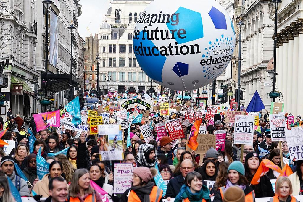 Félagar í verkalýðsfélaginu National Education Union krefjast hærri launa og betri vinnuskilyrða í Westminster í London í gær. Ljósmynd/Jordan Pettitt/Getty Images