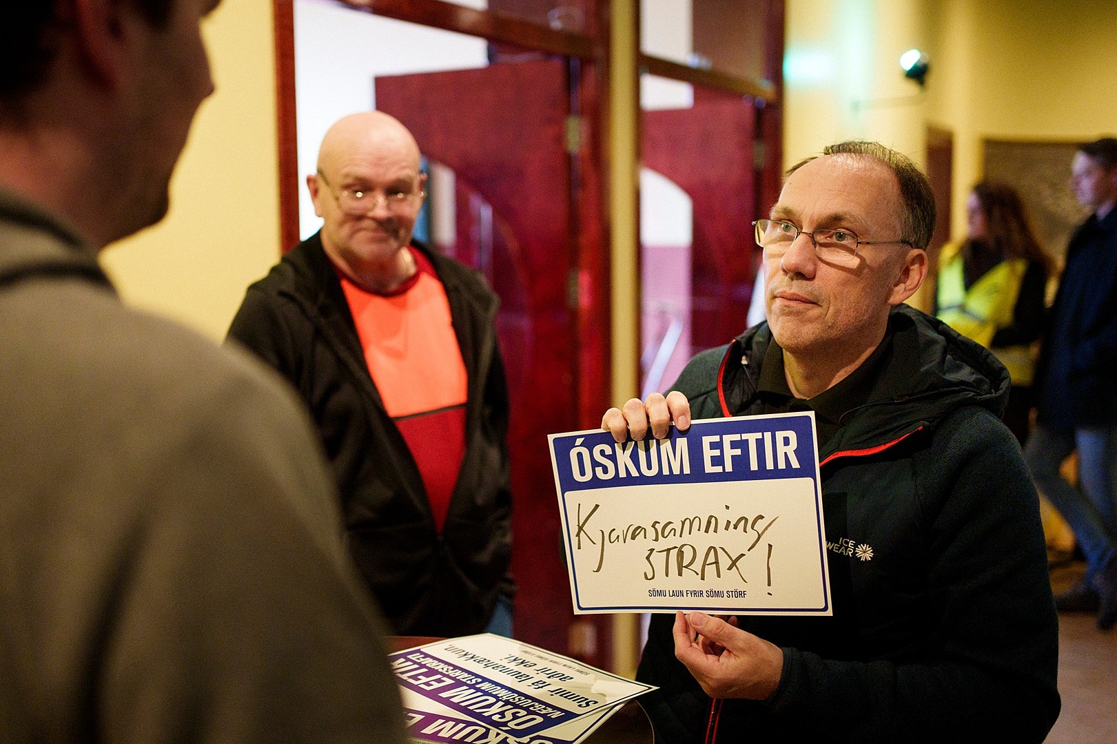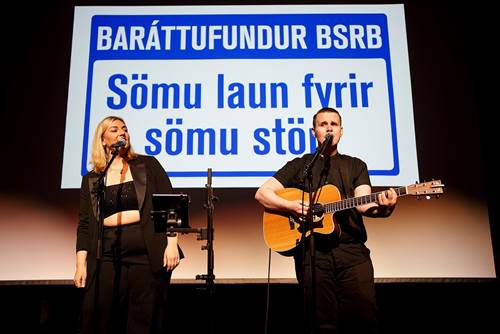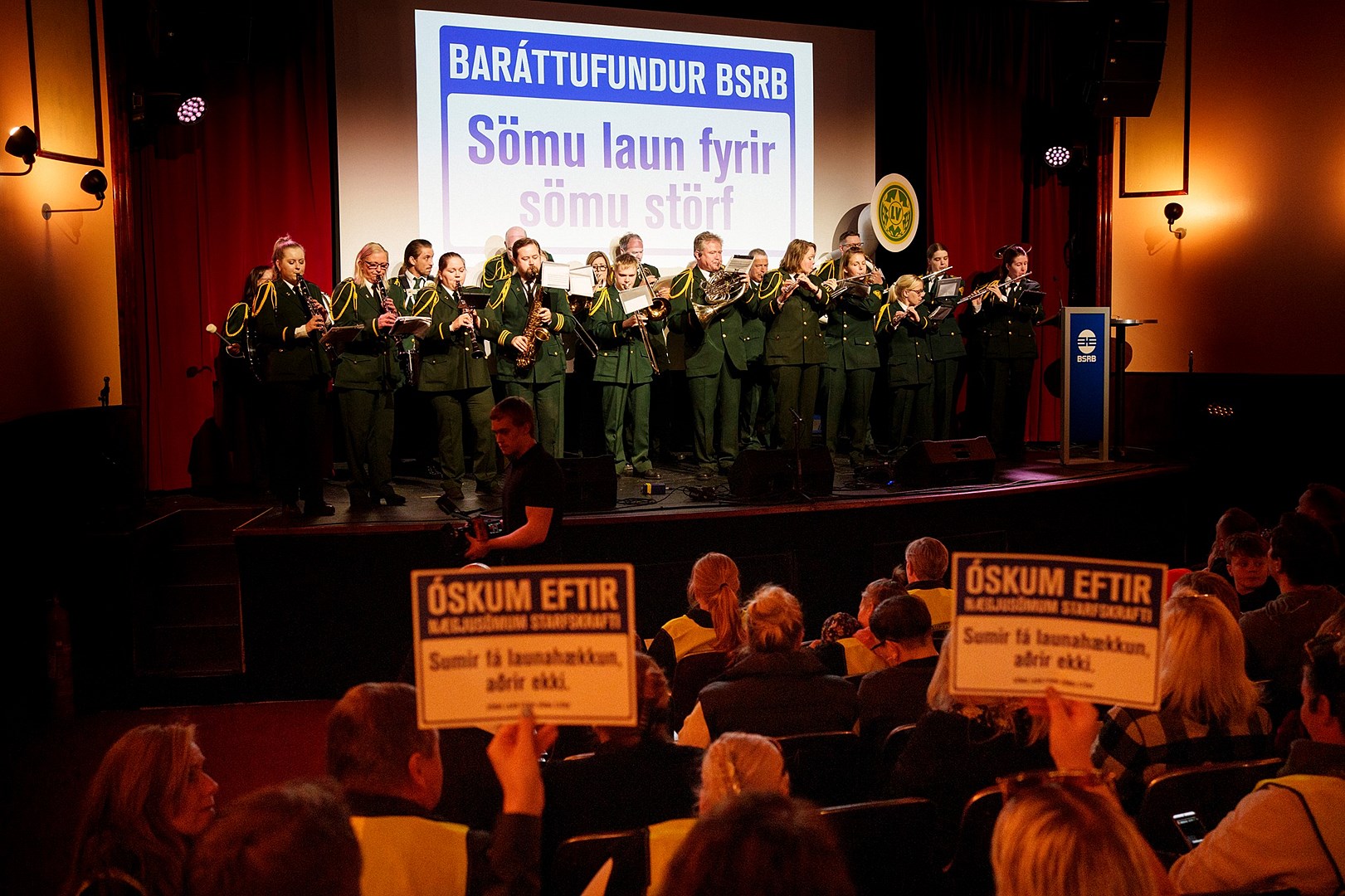 BSRB stóð fyrir baráttufundi í Bæjarbíói í Hafnarfirði í gær vegna kjaradeilu bandalagsins við Samband íslenskra sveitarfélaga. Mikil baráttu- og samstöðuandi sveif yfir vötnum á fundinum. Kröfur félagsfólks eru m.a. að SÍS sýni starfsfólki sínu réttlæti og greiði sömu laun fyrir sömu störf.
