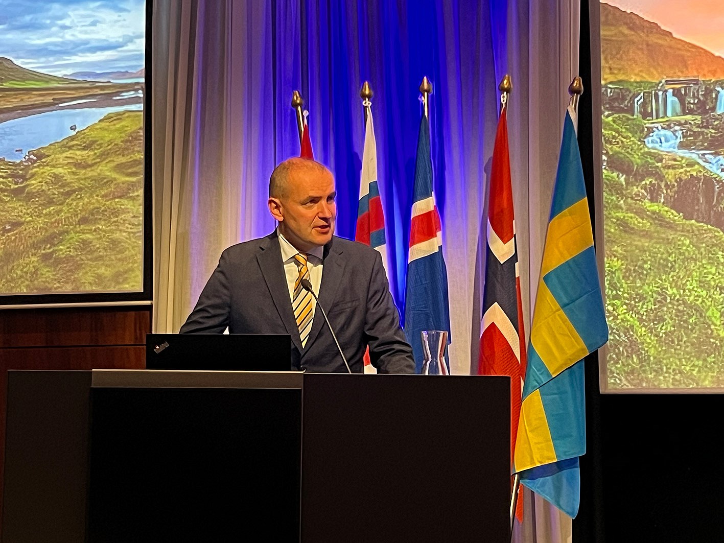 Knut Roger, framkvæmdastjóri NTR, óskaði forseta Íslands, Guðna Th. Jóhannessonar til hamingju með afmælisdaginn, færði honum blómvönd og þakkaði honum komuna á ráðstefnuna sem er í fyrsta sinn í sögu NTR að þjóðhöfðingi flytur ávarp á ráðstefnu þess.