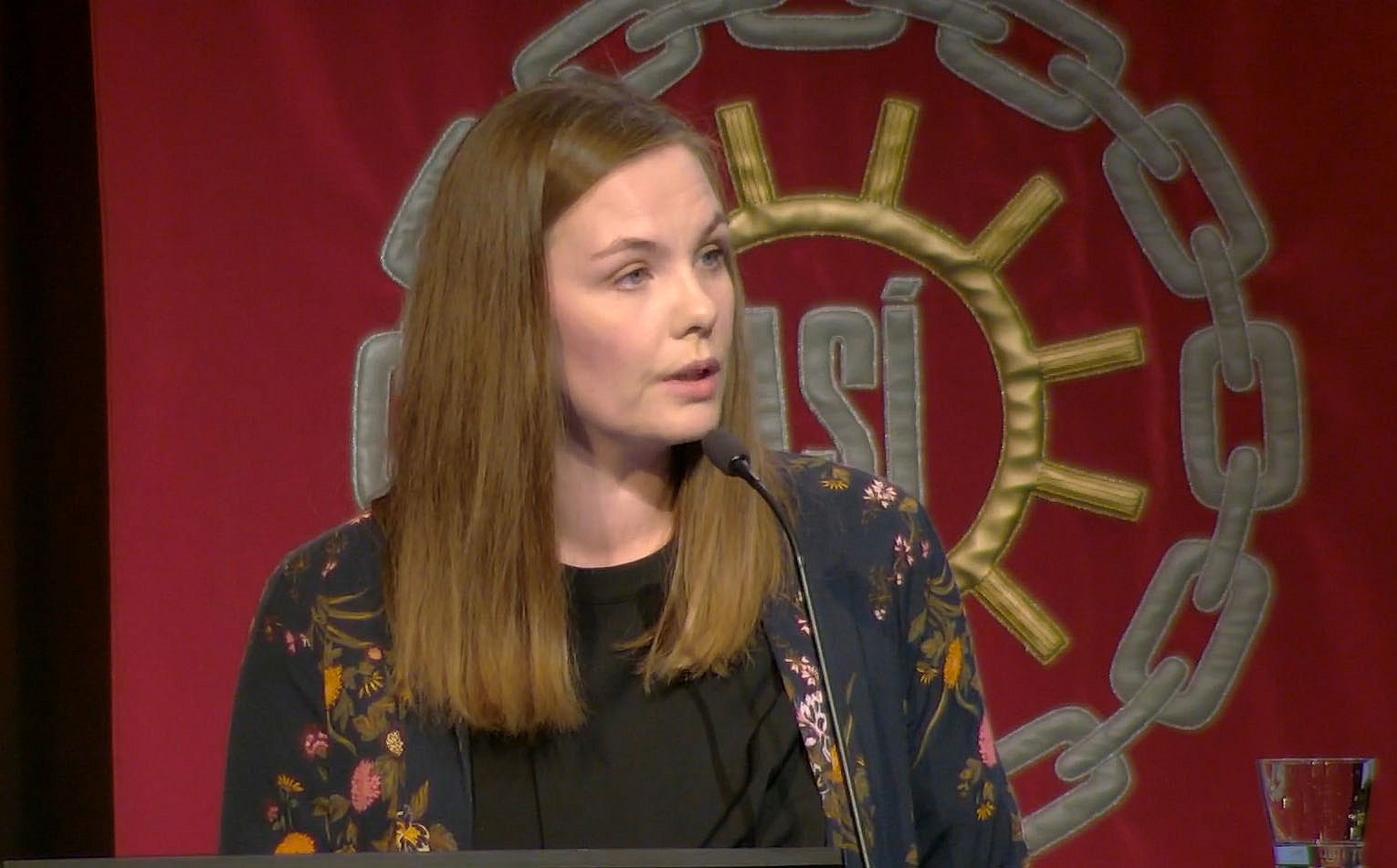 Sonja Ýr Þorbergsdóttir, formaður BSRB, ávarpar 46. þing ASÍ í morgun. Mynd/skjámynd.
